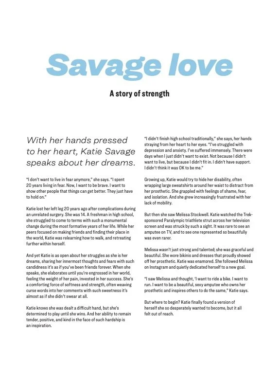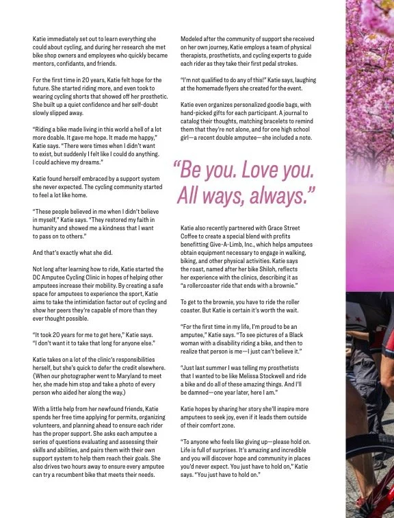Katie Savage launched the non-profit Give-A-Limb, Inc. in Maryland to help amputees obtain the equipment and support they need to increase their mobility. The organization creates safe spaces for amputees to build community through cycling clinics, support groups, workshops, and more.